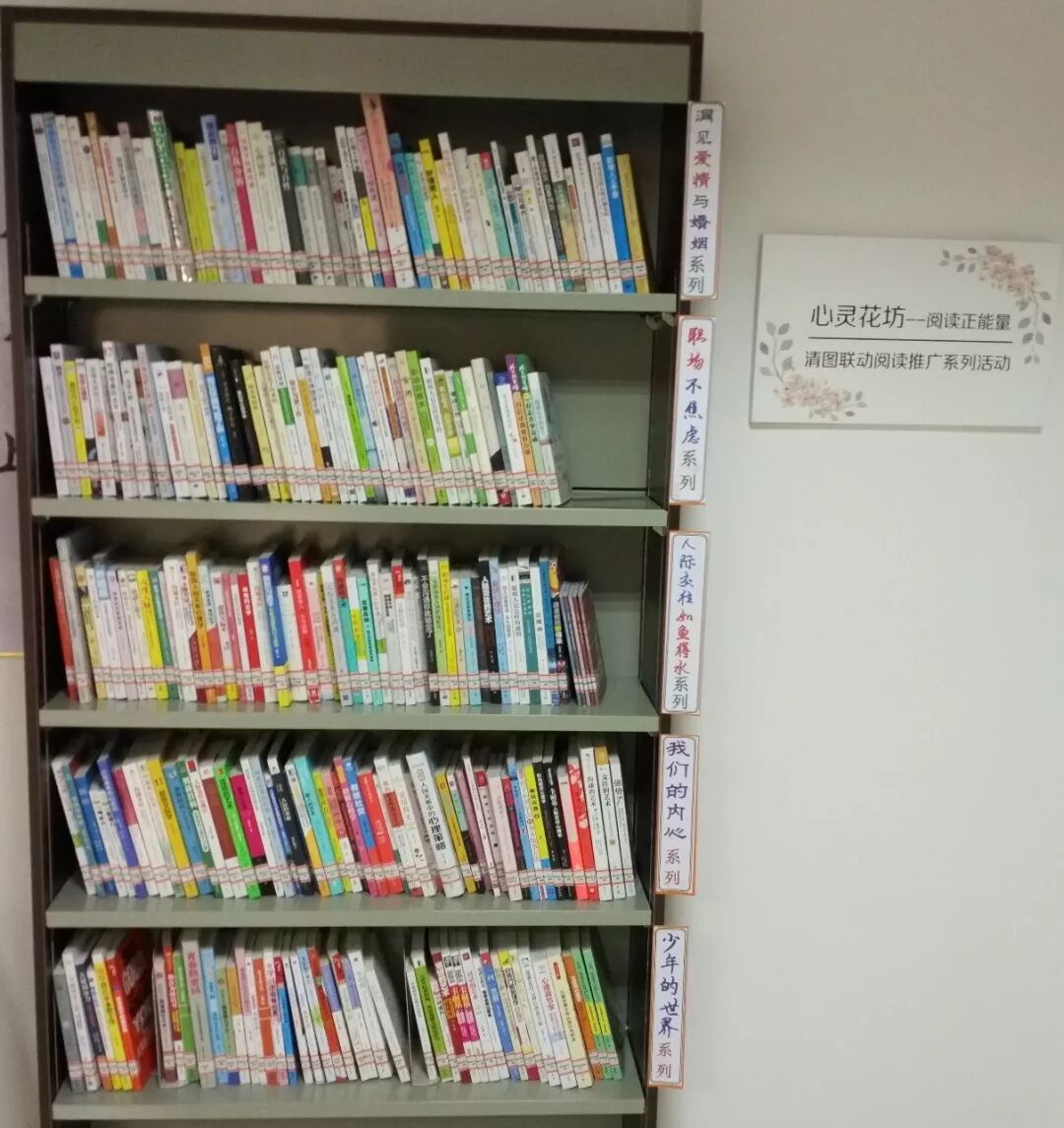 清远市各县区图书馆10馆联办“心灵花坊”阅读推广系列活动,在我馆四楼综合外借室大厅建立“心灵花坊”图书推荐专区,图书分五大主题,分别是洞见爱情与婚姻、职场不焦虑、人际交往如鱼得水、我们的内心、少年的世界。