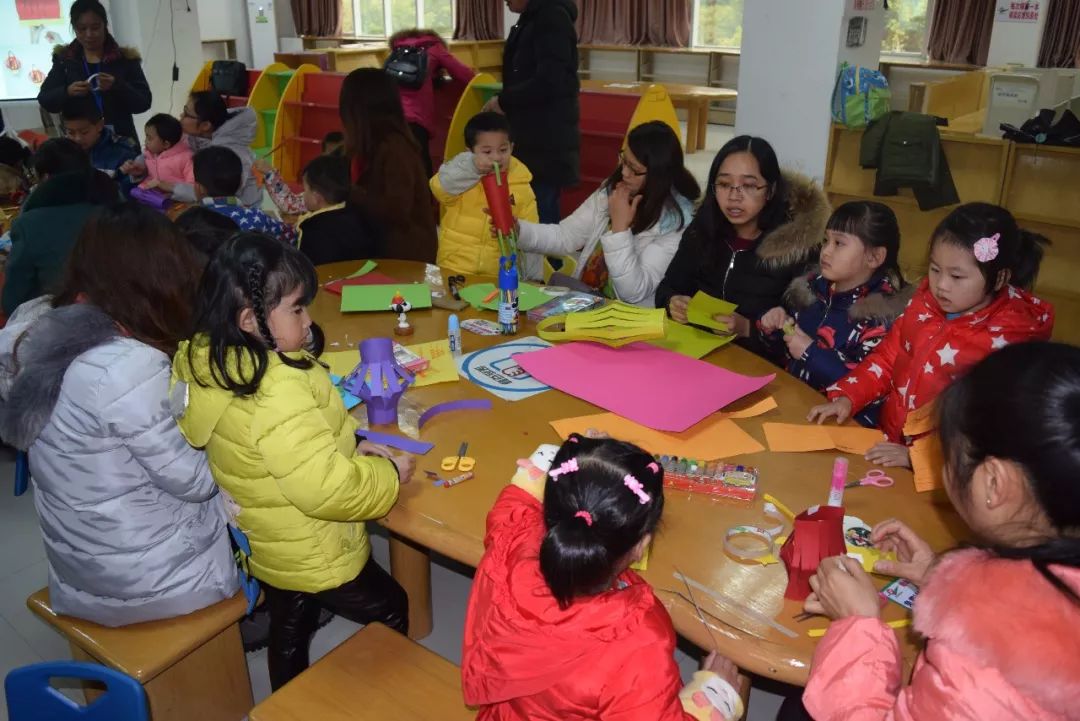 瞧:大家齐动手,家长和孩子们一起做一个手工灯笼。