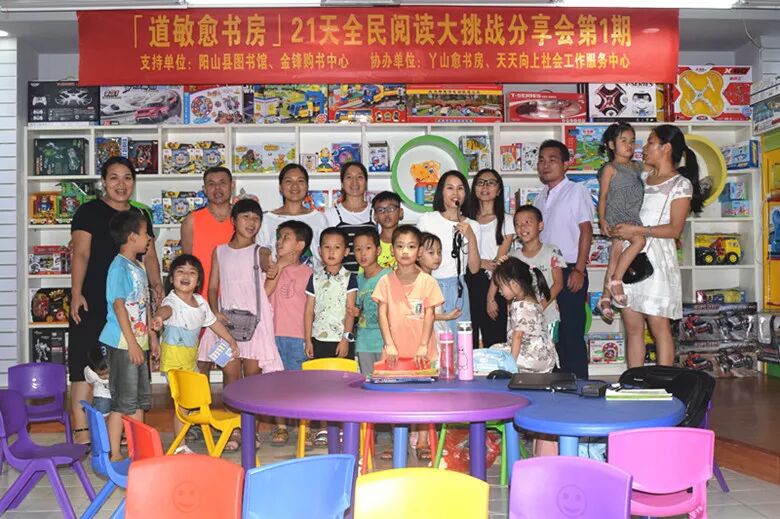 在国家大力倡导“全民阅读”的时代,为扩大阳山县图书馆青少儿阅读推广的影响力,由县图书馆携手金锋购书中心在丫山愈书房及天天向上社会工作服务中心的支持下举办的[道敏愈书房]21天全民阅读大挑战第一期分享会于8月3日晚8点在金锋购书中心首次温情亮相。此次活动旨在为小读者们提供一个交流感情、共同成长的平台,以孩子们喜闻乐见的形式,相互交流读书感悟,共同培养“爱读书、读好书”的好习惯。